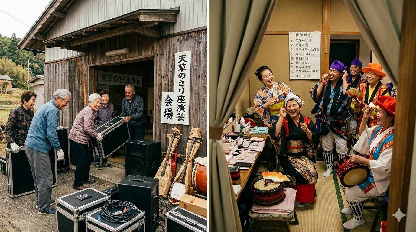 A:基本的には会場(公民館など)をご用意いただければ、音響機材や小道具などは私たちが持参いたします。